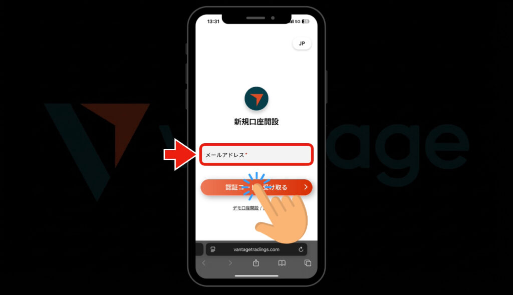 ② メールアドレスを入力し、認証コードを受け取るをタップ