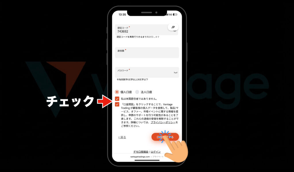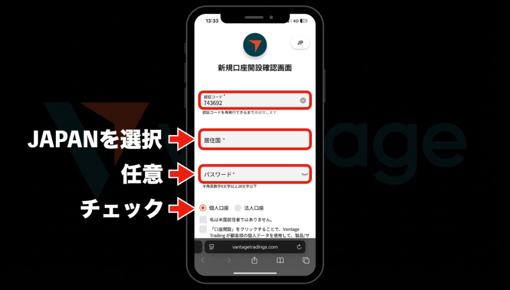 認証コードを確認したら先ほどの口座開設画面へ戻ります。