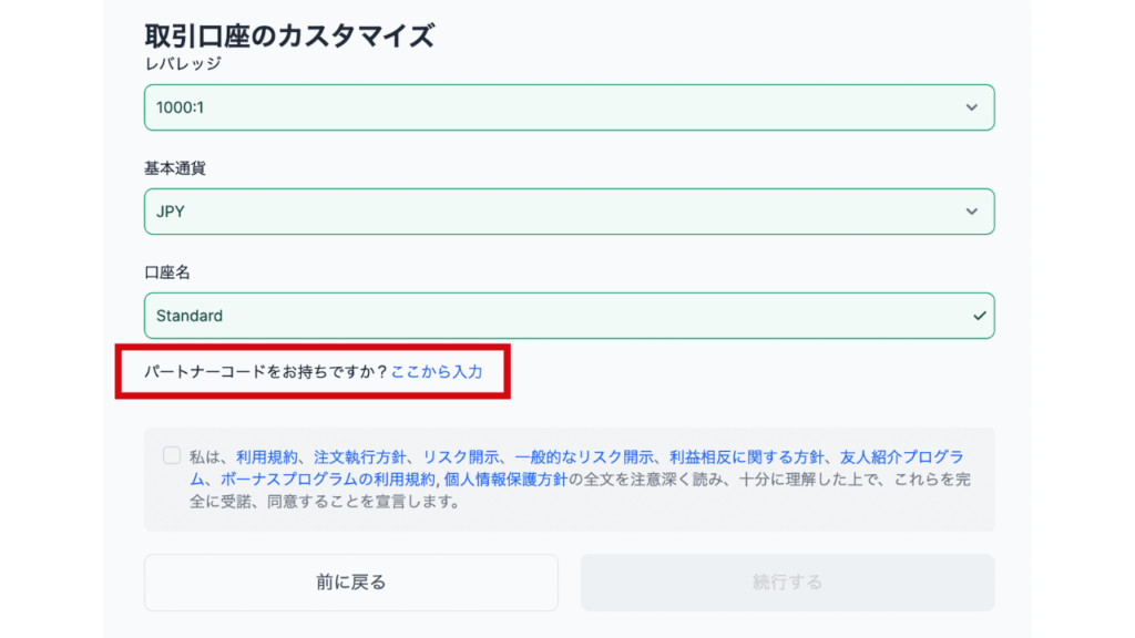 追加口座開設の際には、必ずパートナーコードをご入力ください。