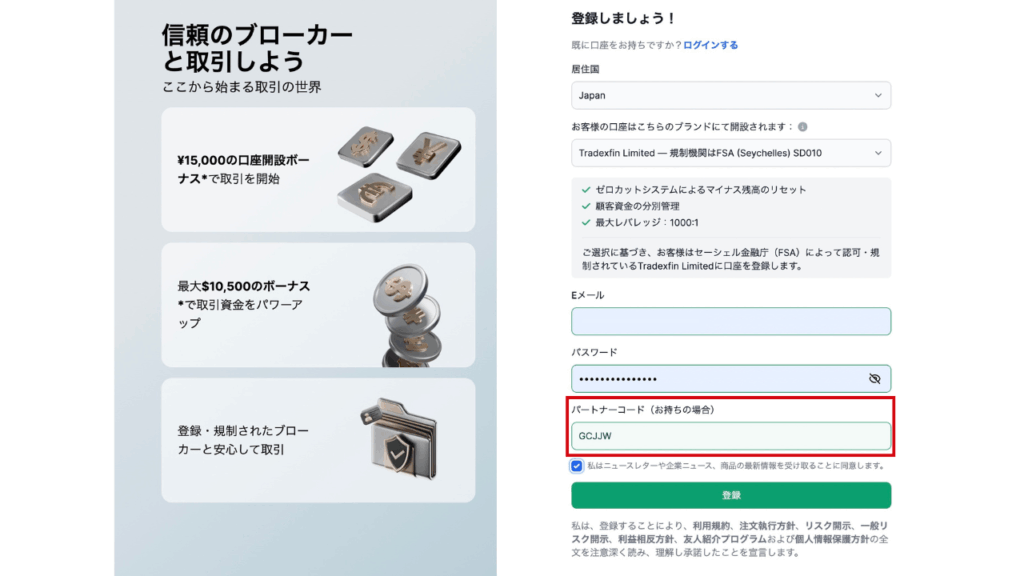 - 口座ブランド(Tradexfin Limited — 規制機関はFSA SD010)※デフォルト設定ブランド